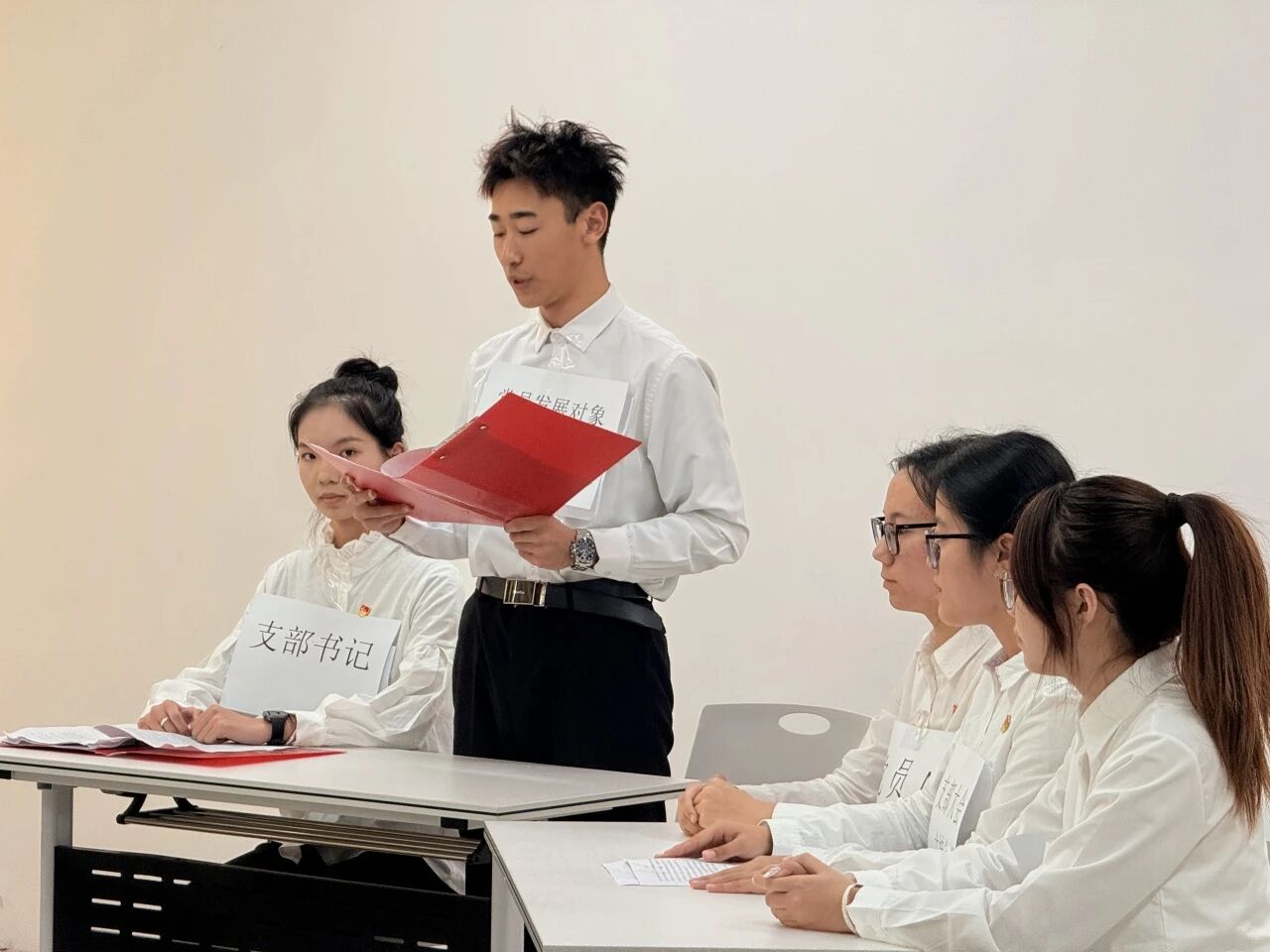 三组同学围绕党员发展的第四环节——预备党员的接收展开演绎。不论是基层党委预审还是部门联审,都体现着党员发展的严肃性,敦促大家在日常工作和学习中,要以高标准严格要求自己,作风务实严谨。